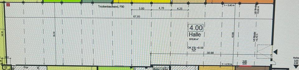 Innenliegende Lagerhalle 67,85m x 15,65/16,10m x 3,40-4,10m